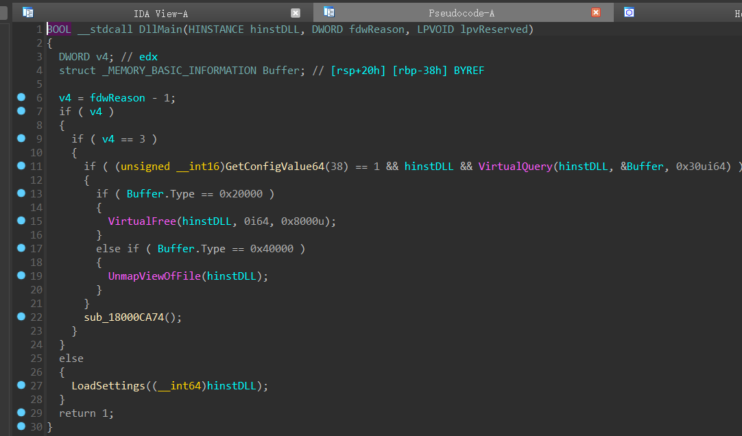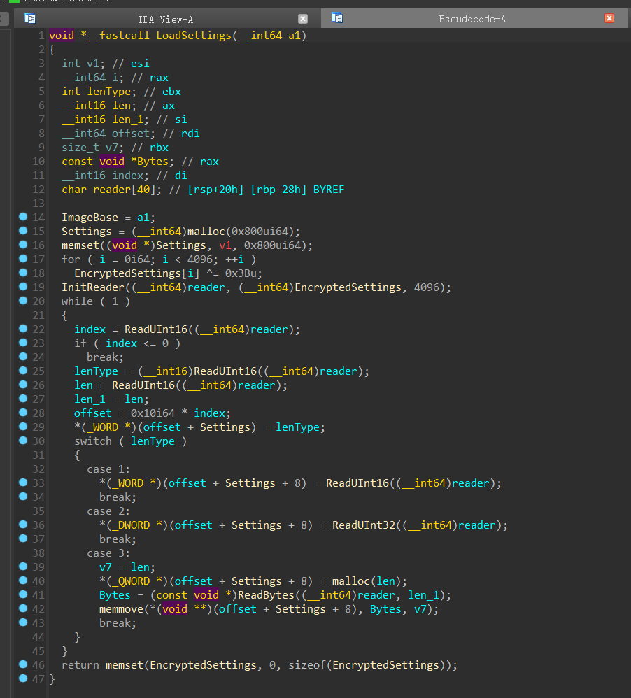 1 2 3 4 5 6 7 8 __declspec(dllexport) HMODULE ImageBase = NULL ; __declspec(dllexport) uint8_t EncryptedSettings[4096 ] = { 0 }; __declspec(dllexport) uint8_t * Settings = NULL ; __declspec(dllexport) void __fastcall LoadSettings (HMODULE hModule) {} __declspec(dllexport) uint16_t __fastcall GetSettingShort (int id) {} __declspec(dllexport) uint32_t __fastcall GetSettingInt (int id) {} __declspec(dllexport) uintptr_t __fastcall GetSettingData (int id) {}