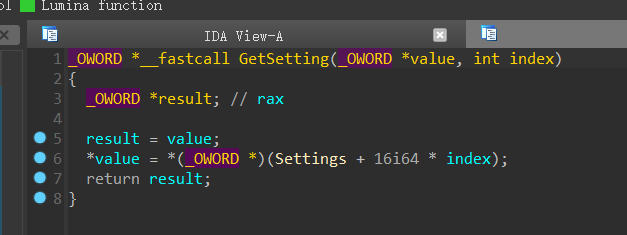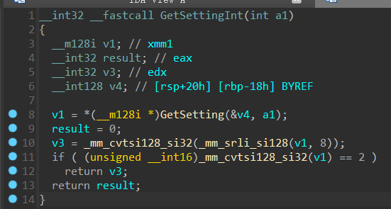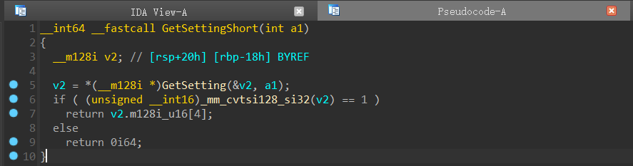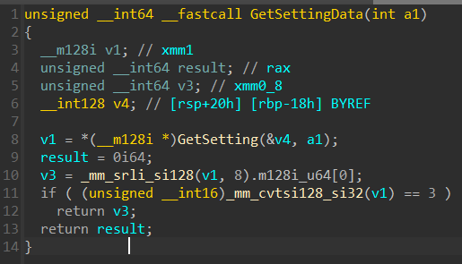 这个GetSetting函数的作用是根据ID获取整个SettingMEM64结构体,分析也和之前的结论一致。注意这里的返回值是OWORD,是16字节类型。