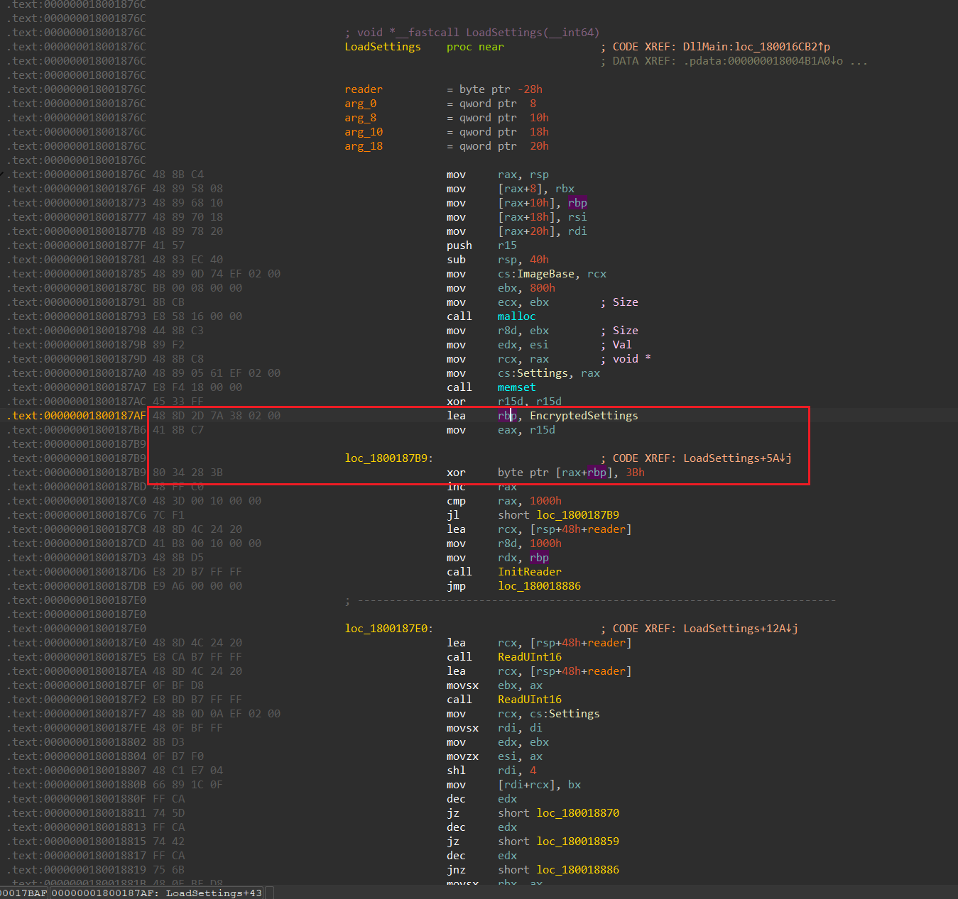 LoadSettings函数的偏移大小都保存在了loadSettings字段,还有相关的xor key,Settings,ImageBase的信息。